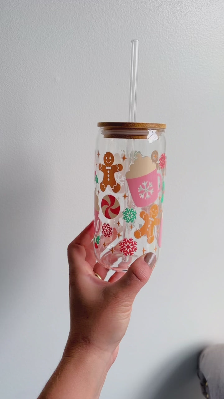 - Gingerbread Christmas Tree Glass Coffee Cup with Bamboo Lid and Glass Straw