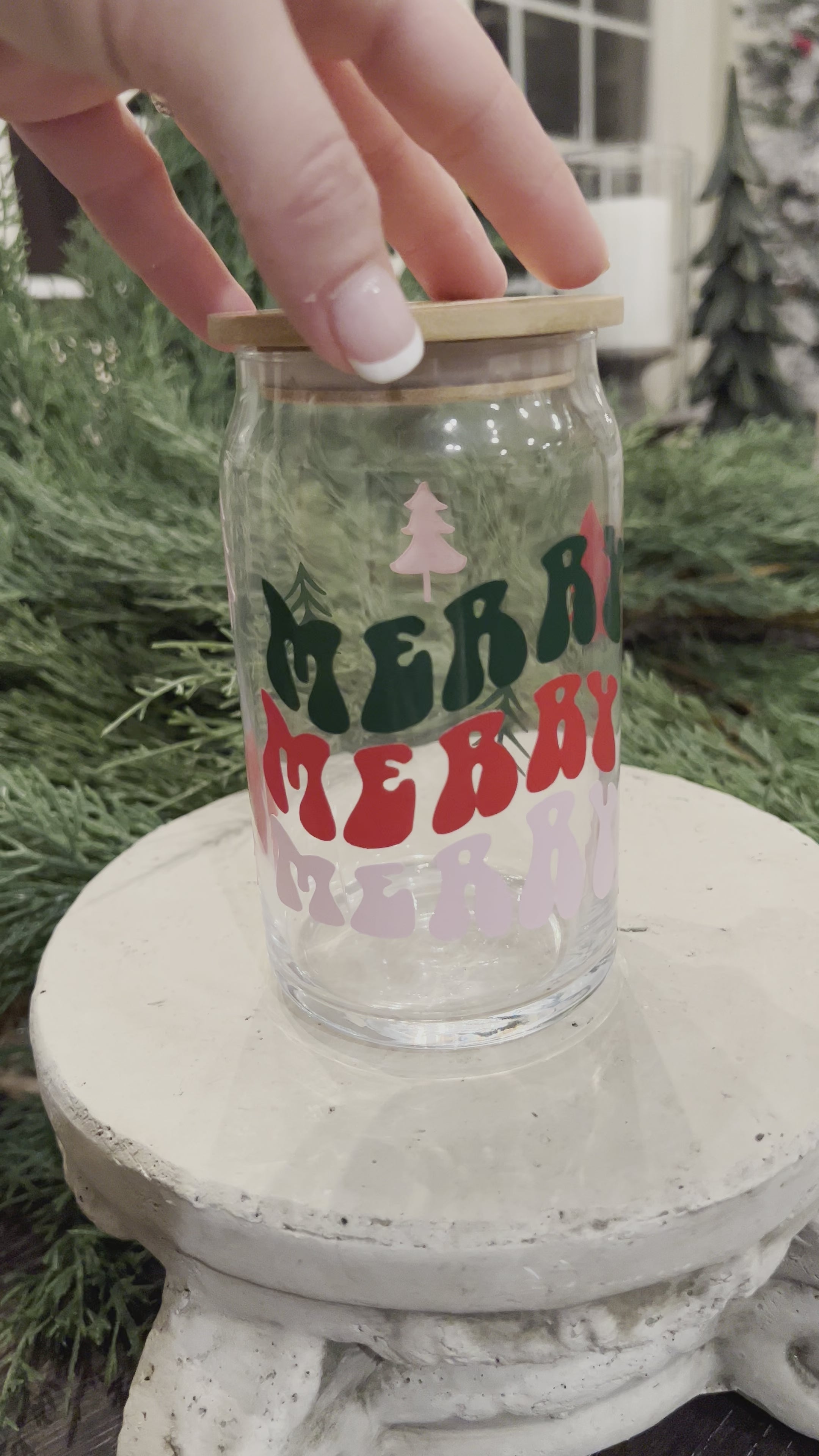 - Merry Merry Merry Christmas Glass Coffee Cup with Bamboo Lid and Glass Straw