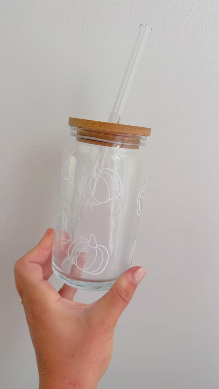 - Fall White Pumpkin Glass Iced Coffee Cup With Bamboo Lid & Glass Straw