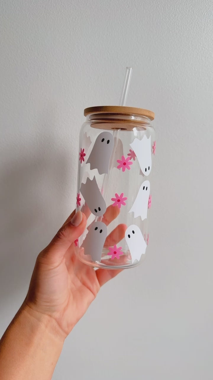 - Pink Ghost Halloween Glass Iced Coffee Cup With Bamboo Lid & Glass Straw
