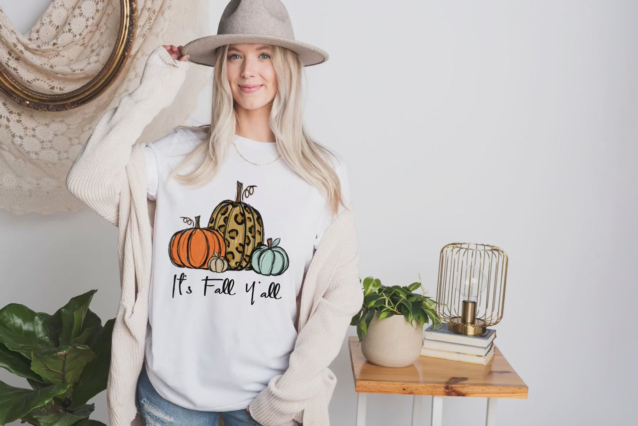 Embrace the spirit of fall with our 'It's Fall Y'all Leopard Pumpkin' White Shirt. Whether paired with jeans or layered under a cozy cardigan, it's the perfect choice for expressing your love for autumn with style and comfort.