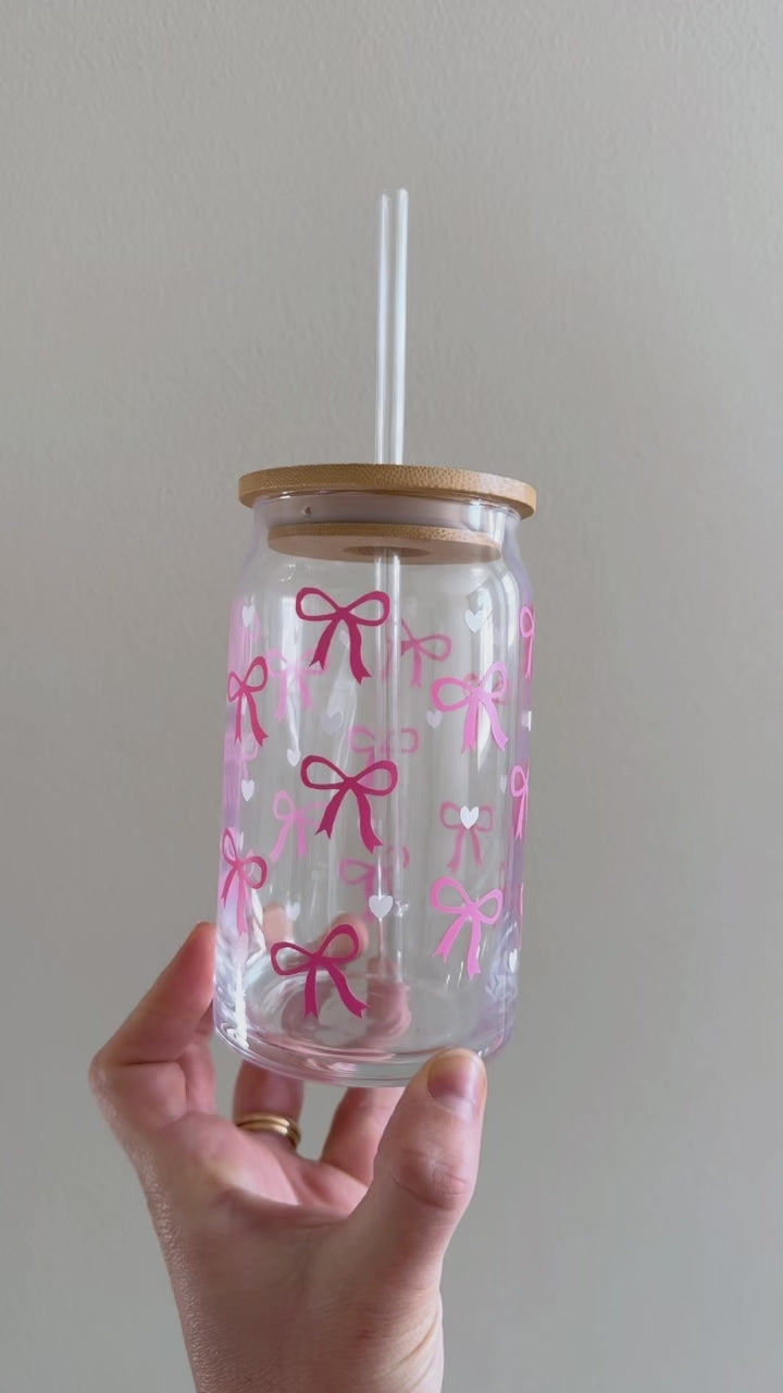 - Coquette Pink Bow Glass With Bamboo Lid & Glass Straw